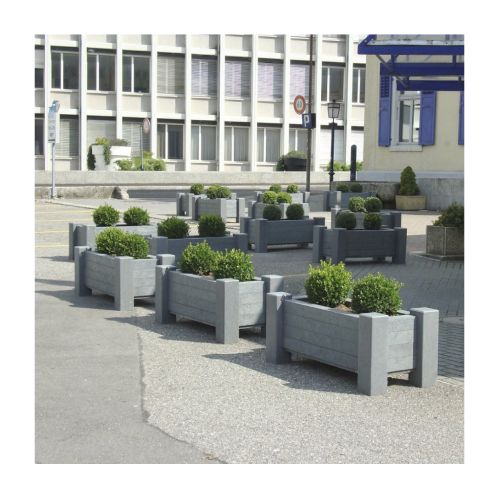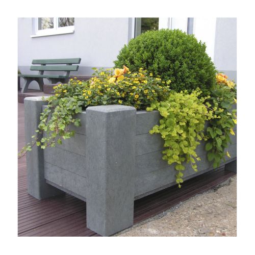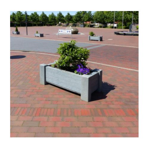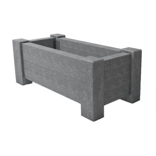 Pārstrādātas plastmasas puķu pods (taisnstūrveida). Īpaši stabils. Izmēri: garums 1300mm, platums 600mm, augstums 500mm, pamatnes biezums 20mm, pamatnes h=80mm, sānu profils 90x90mm, kāju profils 120x160mm. Citi izmēri pēc pieprasījuma. Krāsa: gaiši pelēka. Izgatavots no pārstrādātas plastmasas. Brīvi stāvošs. Svars: 128kg. Tilpums: 137l. Piemērots publiskās un komerciālās vietās, privātās vietās – gājēju zonās, autosstāvvietās, degvielas uzpildes stacijās, meža takās, parkos u.c. Mūsdienīga neitrāla forma. Puķu pods tiek piegādāts samontētā veidā. Ražots Vācijā.