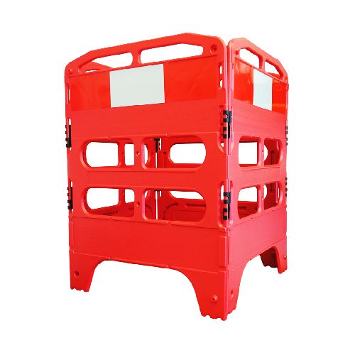 Plastmasas barjera, četrdaļīga. Krāsa: sarkana. Barjeras posma garums 1000mm, kopējais garums 4000mm, augstums 1000mm. Barjeras pieejamas dažādās krāsās. Ražots no 100% pārstrādājama materiāla. Viegla un izturīga. Svars: 16kg.