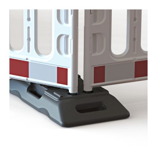 Plastmasas barjera – balta ar sarkanām atstarojošām joslām (pēdas komplektā nav iekļautas). Izmēri: garums 2000mm, platums 1000mm, dziļums 50mm. Savienojama kopā, izmantojot augstas stiprības āķi. Tērauda cauruļu kājas palielina izturību un stabilitāti. Pilnībā pārstrādājama. Izgatavota no HDPE materiāla. Uz pasūtījuma iespējama citās krāsās. Svars: 9.5kg.
