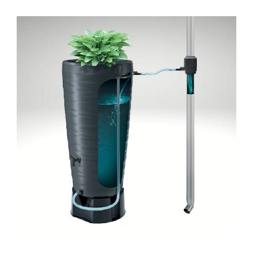 Tvertne lietus ūdens uzkrāšanai SAM ar noņemamu vāku – puķu podu. Aprīkota ar 2 caurumiem krānam un ūdens ieplūdes šļūtenes savienošanai. Krāns (1/2 colla) un ūdens savācējs/novirzītājs nav iekļauts komplektā. Iekļauts statīvs/pamatne. Tilpums: 240L. Izgatavota no UV izturīga polipropilēna. Izmēri: platums 590mm, dziļums 590mm, augstums 1140mm. Caur notekcaurulēm pa ūdens savācēju/novirzītāju lietus ūdens tiek novadīts uz tvertni. Pieejamās krāsas: antracīta pelēka un pelēka. Svars: 7kg.