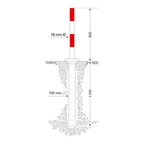 Pusautomātisks paceļams stabs (ar trijstūrveida atslēgu). Izmēri: diametrs 76mm, caurules biezums 2,5mm, kopējais augstums 2050mm, augstums virs zemes 900mm, augstums zem zemes 1150mm (apakšējās betonējamās daļas izmērs 100×100 mm). Krāsa: sarkanbalta. Izgatavots no tērauda. Stabs ir betonējams. Ideāli piemērots ielām un laukumiem, kas tikai reizēm atvērti satiksmei: gājēju ielām, laukumiem, autostāvvietām, piebraucamajiem ceļiem u.c. Izturīgs pret koroziju (karsti cinkots + krāsots). Svars: 23kg.