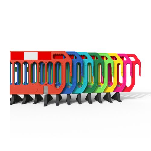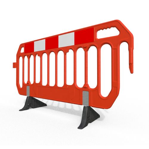 PVC barjera SPACE SAVER (plāna), oranža ar ne-standarta (Anti-Trip) pēdām. Garums: 2000mm, augstums 1000mm, biezums 25mm. Svars ar Anti-Trip pēdām 8.2kg. Izgatavota no UV stabila HDPE. 100% pārstrādājama. Uz paletes: 80gab.