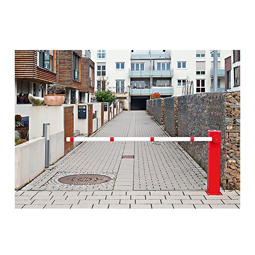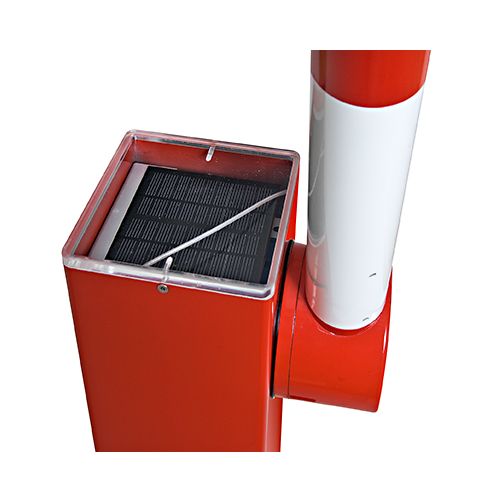 Elektriskā paceļamā barjera. Garums: 2500mm, kopējais garums: 2650mm, barjeras d=60mm. Darbojas uz integrētu saules moduli. Nav nepieciešams elektrības pievads. Sarkans alumīnija korpuss, balta barjera ar sarkanu atstarojošu lentu (barjeras d=60mm). Komplektā tālvadības pults un akumulators (6V). Tālvadības pults darbības diapazons – 12m. Stiprināma ar 6 skrūvēm. Svars: 31kg.