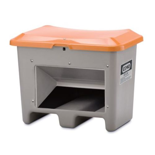 Smilts/sāls konteiners (atvērtā tipa) ar iekrāvēja ejām (viegli ar iekrāvēju ratiņiem vai iekrāvēja dakšām pārvietot uz citu vietu). Ietilpība: 200l. Krāsa: pelēka ar oranžu vāku. Izmēri: garums 890mm, platums 600mm, augstums 690mm. Izgatavots no pastiprinātas stiklšķiedras. Korozijas un laika apstākļu izturīgs. Nerūsējošā tērauda aizbīdņi. Piemērots smilts, sāls vai kāda cita materiāla uzglabāšanai ziemas/vasaras periodos. Svars: 14kg.