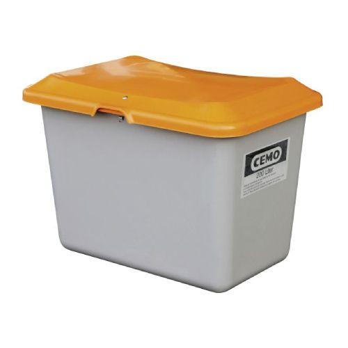 Smilts/sāls konteiners. Ietilpība: 200l. Krāsa: pelēka ar oranžu vāku. Izmēri: garums 890mm, platums 600mm, augstums 640mm. Izgatavots no pastiprinātas stiklšķiedras. Korozijas un laika apstākļu izturīgs. Nerūsējošā tērauda aizbīdņi. Piemērots smilts, sāls vai kāda cita materiāla uzglabāšanai ziemas/vasaras periodos. Svars: 11.3kg.