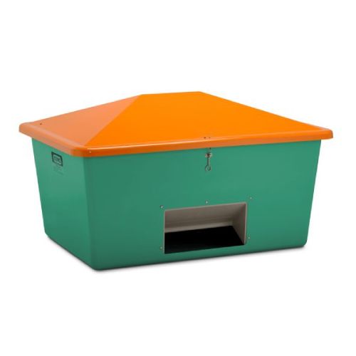 Smilts/sāls konteiners (atvērtā tipa). Ietilpība: 1500l. Krāsa: zaļa ar oranžu vāku. Izmēri: garums 1840mm, platums 1430mm, augstums 1040mm. Izgatavots no pastiprinātas stiklšķiedras. Ar nerūsējošā tērauda slēdzamiem vāka balstiem. Korozijas un laika apstākļu izturīgs. Piemērots smilts, sāls vai kāda cita materiāla uzglabāšanai ziemas/vasaras periodos. Svars: 72kg.