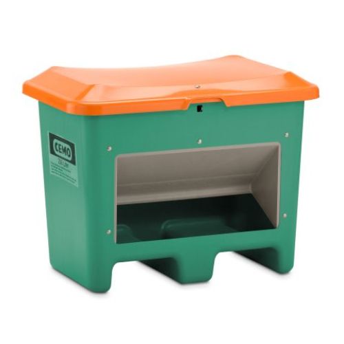 Smilts/sāls konteiners (atvērtā tipa) ar iekrāvēja ejām (viegli ar iekrāvēju ratiņiem vai iekrāvēja dakšām pārvietot uz citu vietu). Ietilpība: 200l. Krāsa: zaļa ar oranžu vāku. Izmēri: garums 890mm, platums 600mm, augstums 690mm. Izgatavots no pastiprinātas stiklšķiedras. Korozijas un laika apstākļu izturīgs. Nerūsējošā tērauda aizbīdņi. Piemērots smilts, sāls vai kāda cita materiāla uzglabāšanai ziemas/vasaras periodos. Svars: 14kg.