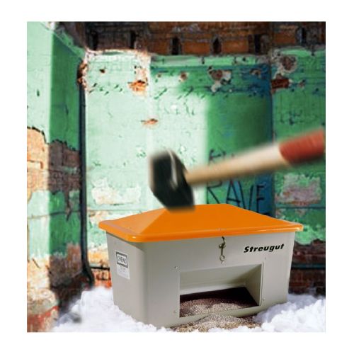 Smilts/sāls konteiners ar pretvandālisma vāku (atvērtā tipa). Ietilpība: 700l. Krāsa: zaļa ar oranžu vāku. Izmēri: garums 1340mm, platums 990mm, augstums 960mm. Izgatavots no pastiprinātas stiklšķiedras. Korozijas un laika apstākļu izturīgs. Nerūsējošā tērauda aizbīdņi. Piemērots smilts, sāls vai kāda cita materiāla uzglabāšanai ziemas/vasaras periodos. Svars: 33kg.