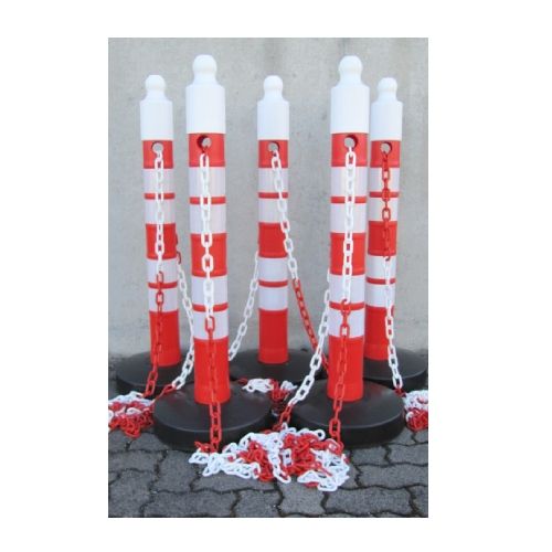 Stabiņu komplekts MegaMax ar ķēdēm (5 stabiņi un 5 ķēdes). Stabiņu krāsa: sarkana ar 4 atstarojošām joslām. Ķēde: sarkanbalta. Ķēdes garums: 5m (kopā 25m).