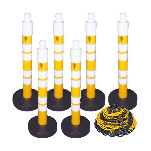 Stabiņu komplekts MegaMax ar ķēdēm (6 stabiņi un 6 ķēdes). Stabiņu krāsa: dzeltena ar 4 baltām atstarojošām joslām. Ķēde: dzeltenmelna. Ķēdes garums: 5m (kopā 25m).