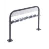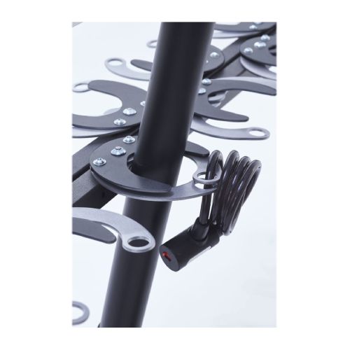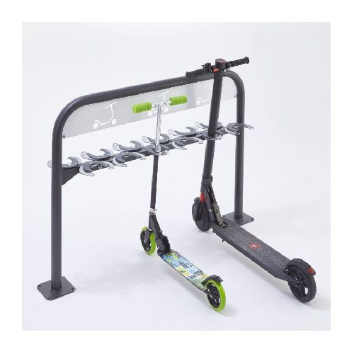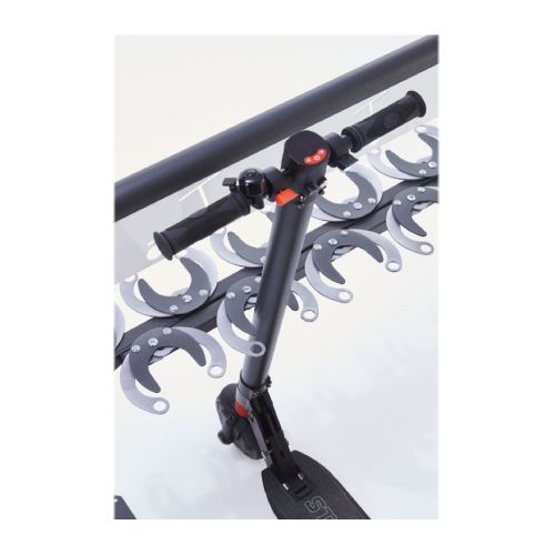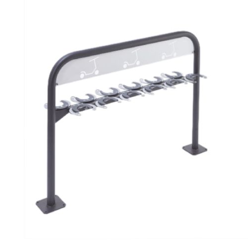 Statīvs 6 skrejriteņiem. Stiprināms pie pamatnes ar skrūvēm (neietilpst komplektā!). Skrejritenis pie stūres caurules tiek nostiprināts ar klipšu saspiešanas sistēmu, ko var nostiprināt ar troses vai U-veida slēdzeni (nav iekļauts komplektācijā). Saspiešanas sistēmā var ievietot skrejriteņa cauruli ar maksimālo d=70mm. Statīvs aprīkots ar 2 pamata plāksnēm (150x150mm; katrā plāksnē 4 caurumi d=11mm), lai to piestiprinātu pie zemes. Izgatavots no d=50mm tērauda caurules, kas krāsots antracīta melnā poliestera krāsā ar gaiši pelēkiem klipšiem. Slēdzenes atveres d=20mm. Kopējie izmēri: garums 1360mm, dziļums 230mm, augstums 94mm. Svars: 27.5kg.