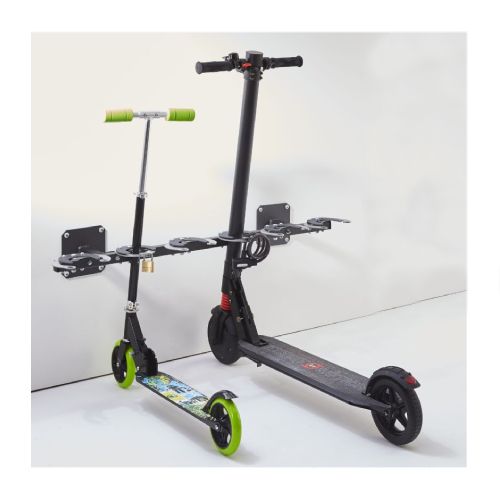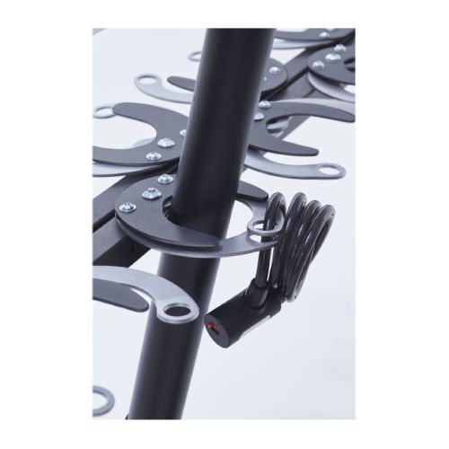 Statīvs 6 skrejriteņiem. Stiprināms pie sienas ar skrūvēm (neietilpst komplektā!). Skrejritenis pie stūres caurules tiek nostiprināts ar klipšu saspiešanas sistēmu, ko var nostiprināt ar troses vai U-veida slēdzeni (nav iekļauts komplektācijā). Saspiešanas sistēmā var ievietot skrejriteņa cauruli ar maksimālo d=70mm. Statīvs aprīkots ar 2 sienas plāksnēm (150x150mm; katrā plāksnē 4 caurumi d=11mm), lai to piestiprinātu pie sienas. Izgatavots no d=30mm tērauda caurules, kas krāsots antracīta melnā poliestera krāsā ar gaiši pelēkiem klipšiem. Slēdzenes atveres d=20mm. Kopējie izmēri: garums 1060mm, dziļums 245mm, augstums 150mm. Svars: 11kg.