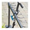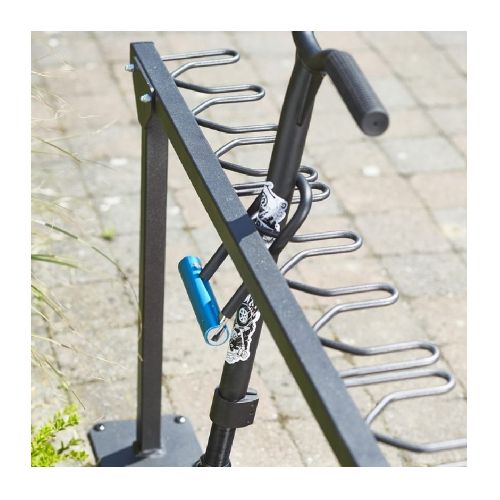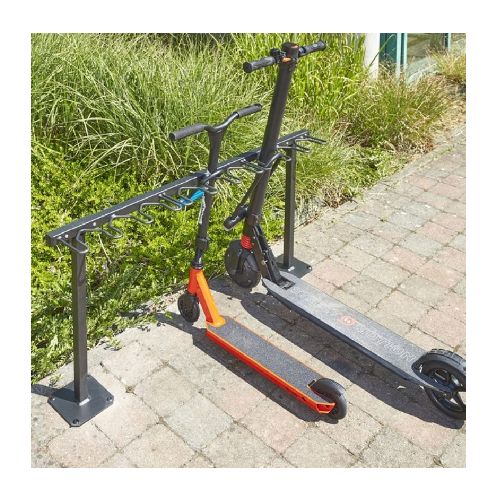Statīvs 9 skrejriteņiem. Stiprināms pie pamatnes ar skrūvēm (neietilpst komplektā!). Skrejritenis pie stūres caurules tiek nostiprināts ar V formas āķiem (maksimāli var piestiprināt skrejriteņus diametrā līdz 70mm. Skrejriteni pie statīva var pieslēgt ar troses vai U-veida slēdzeni (nav iekļauts komplektācijā; slēdzenes caurums d=22mm). Statīvs aprīkots ar 2 pamata plāksnēm (150x150mm; plāksnē 4 caurumi d=11mm), lai to piestiprinātu pie zemes. Materiāls: daudzslāņu krāsa ar pretrūsas apstrādi, 1 pretkorozijas slānis un 1 antracīta pelēks epoksīda pulverkrāsas slānis. Kopējie izmēri: garums 1190mm, platums 200mm, augstums 590mm. Statīvs izgatavots no kvadrātveida caurules 30x30x2mm augšpusē un malās, skrejriteņa piestiprināšanas vietās – caurules d=8mm. Svars: 7.5kg.