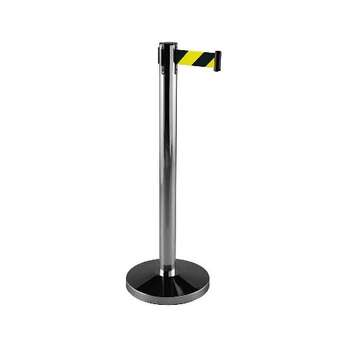 Nerūsējošā tērauda statīvs ar izvelkamu lentu. Pulēta apdare. Stabils. Izmēri: statīva augstums 910mm, statīva d=63mm, pamatnes d=320mm (betona pildīta), izvelkamās lentas platums 48mm, lentas garums 2.7m. Lentas pieejamās krāsas: sarkanbalta, dzeltenmelna. Svars: 8kg.