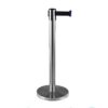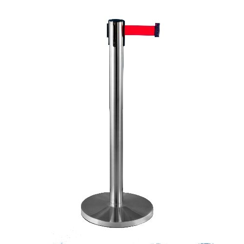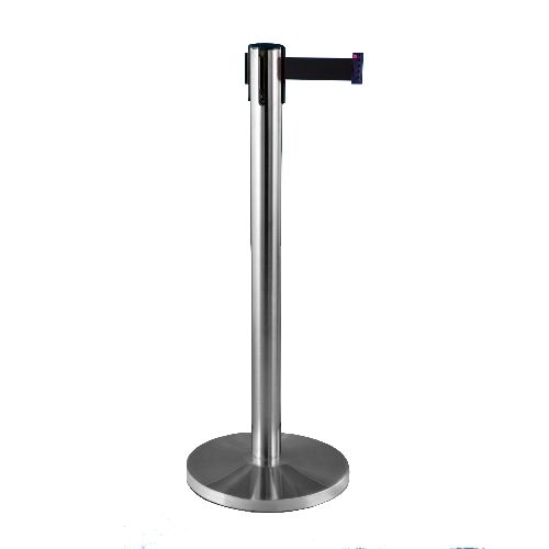Nerūsējošā tērauda statīvs ar izvelkamu lentu. Matēta apdare statīvam ar pamatni. Stabils. Izmēri: statīva augstums 910mm, statīva d=63mm, pamatnes d=320mm (betona pildīta), izvelkamās lentas platums 48mm, lentas garums 2.7m. Lentas pieejamās krāsas: sarkana, melna, zila. Svars: 8kg.