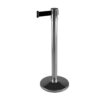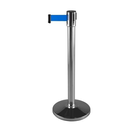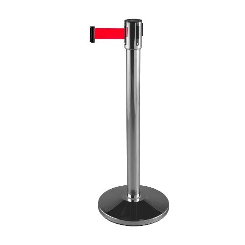 Nerūsējošā tērauda statīvs ar izvelkamu lentu. Pulēta apdare. Stabils. Izmēri: statīva augstums 910mm, statīva d=63mm, pamatnes d=350mm (betona pildīta), izvelkamās lentas platums 48mm, lentas garums 4.5m. Lentas pieejamās krāsas: melna, sarkana, zila. Svars: 9kg.