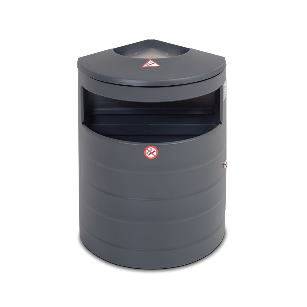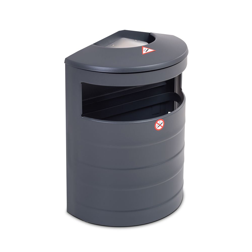 Tērauda atkritumu tvertne. Tilpums: 20L. Izmērs: 420x210x560mm. Atvērtne atkritumiem: 110x390mm. Vienpusējas durvis. Materiāls: cinkots tērauds (1mm). Nav perforēta. Ar uguns-drošības pelnu trauku augšpusē. Svars: 6.1kg.