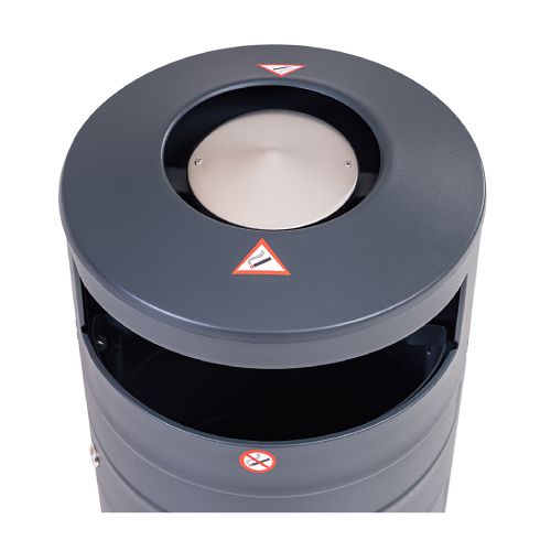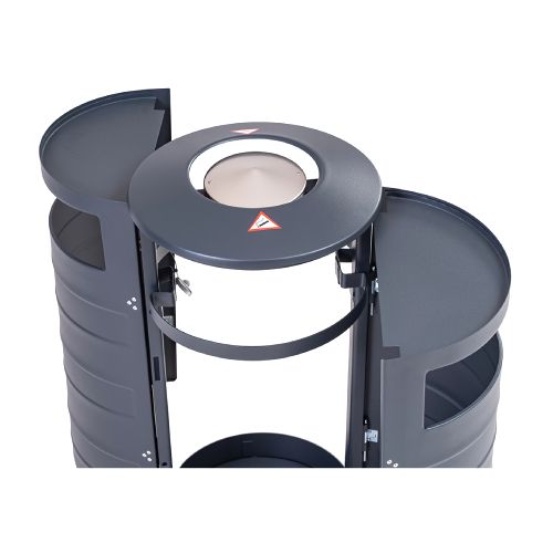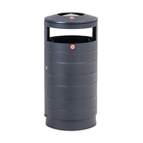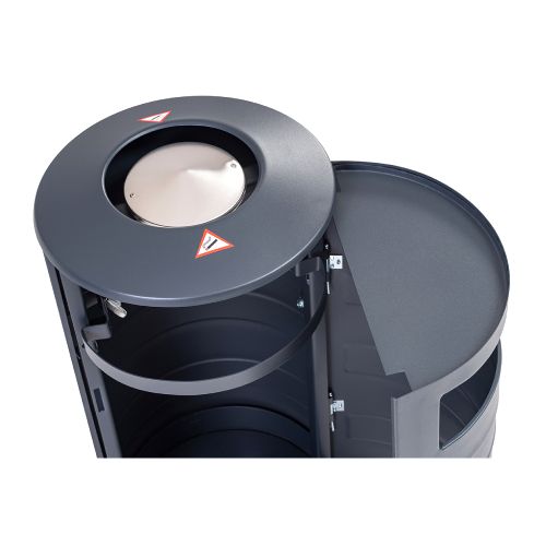 Tērauda atkritumu tvertne ar pelnu trauku un maisa turētāju. Tilpums: 70l. Krāsa: RAL 7016 (pelēka). Izmēri: d=420mm, h=870mm. Materiāls: cinkots tērauds (1.5mm). Slēdzamas, veramas divpusējas durvis, maisa turētājs (par papildus samaksu iespējams iegādātoes iekšējo cinkoto spaini). Tvertne stiprināma pie cietas pamatnes. Svars: 19kg. Bildēs attēlota pilnākā komplektācija!