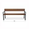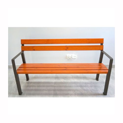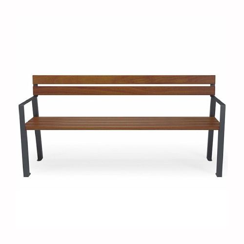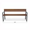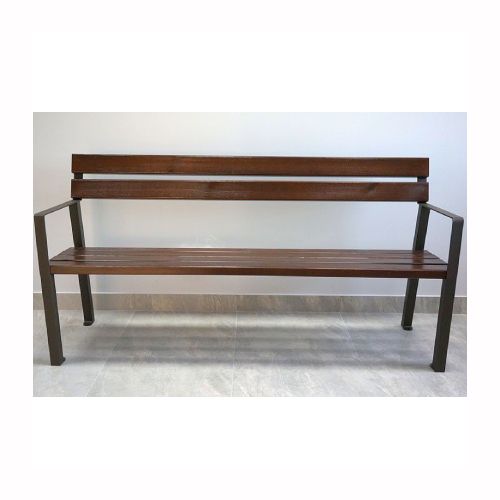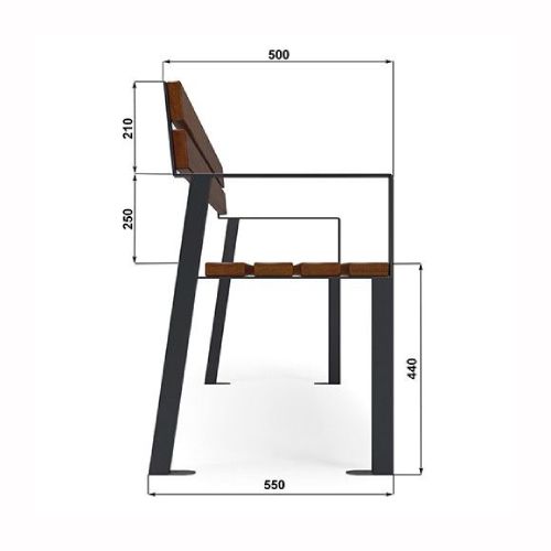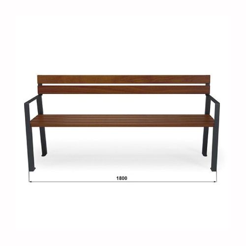 Tērauda soliņš ar atzveltni un roku balstiem. Izmēri: kopējais soliņa garums 1800mm, kopējais augstums 900mm, sēdekļa augstums 440mm, kopējais dziļums 550mm. Metāla detaļas cinkotas un krāsotas RAL tonī (pieejamie toņi: melns RAL 9005, grafīta pelēks RAL 7021, sudraba pelēks RAL 9006, pelēks RAL 9007, dzeltens RAL 1023, brūns RAL 8011, sarkans RAL 3002, zaļš RAL 6018, oranžs RAL 2000). Metālam 45x45x2mm profils (kājām) un roku balstiem – plakanais stienis 45x5mm. Pieejams arī nerūsējošā tērauda variants (pēc pieprasījuma). Pieskrūvējams pie pamatnes ar skrūvēm vai betonējams (pēc izvēles). Koka dēlīšu pieejamie toņi: gaišs ozols vai palisandrs (tumši brūns) – pēc izvēles. Skuju koka dēlīšu izmērs: 1800x90x37mm.
