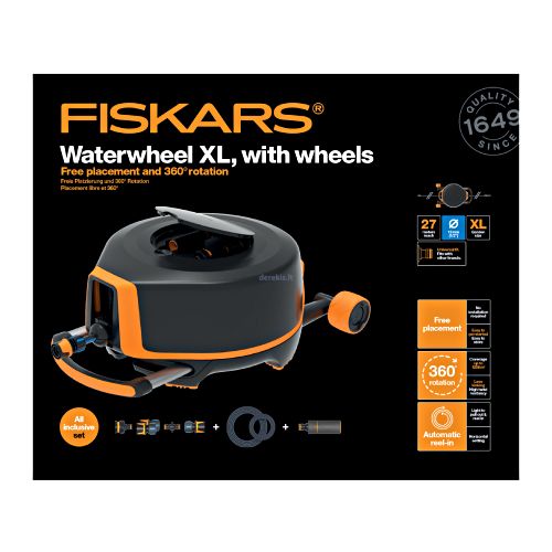 Universāls ūdensrats FISKARS Waterwheels XL ar riteņiem. Ūdensratu XL var novietot jebkurā vietā dārzā, kas padara laistīšanu vieglu un patīkamu – neviens stūris / koks netraucēs šļūtenei. 360 grādu rotācija ļauj tuvoties jebkuram zāliena leņķim un paplašina laistīšanas laukumu līdz 1256 kv.m. Novatorisks horizontālais iestatījums padara neiespējamu tītavas apgāšanu izmantojot to dārzā. Automātiskā sarullēšana un visi nepieciešamie aksesuāri, ieskaitot savienotājus un laistīšanas uzgali, kuri tiek glabāti speciālajā ūdensrata nodalījumā. Ūdensrats ir kompakts un viegli uzglabājams. Sienas stiprinājums pieejams atsevišķi.