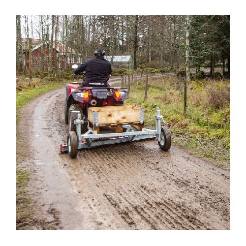 Velkamais ceļa greideris uz 2 riteņiem. Stiprināms pie kvadracikla vai maziem traktoriem. Darba platums 1800mm. Greidera naža garums 1930mm. Komplektā puspaletes kravas kaste. Naža leņķis ir individuāli regulējams ar riteņiem (par 15cm), lai pielāgotos ceļa slīpumam. Izturīgi riteņi, pilnībā cinkots rāmis. Stiprināšanai pie tehnikas rotējošs 50mm lodveida savienojums. Greideris piemērots pagalmu, laukumu, izjādes laukumu, dažādu celiņu nolīdzināšanai.