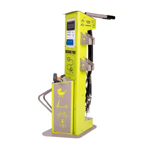 Velosipēdu remonta/uzlādes stacija ar rokas pumpi un statīvu (cinkota un krāsota RAL tonī)