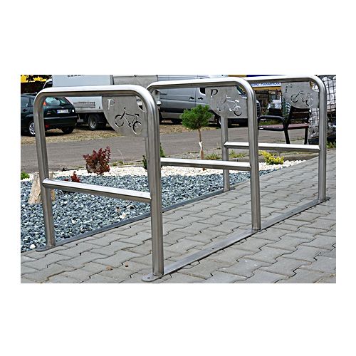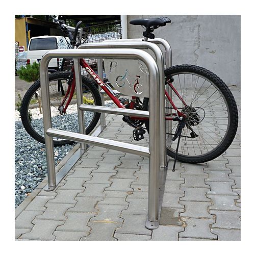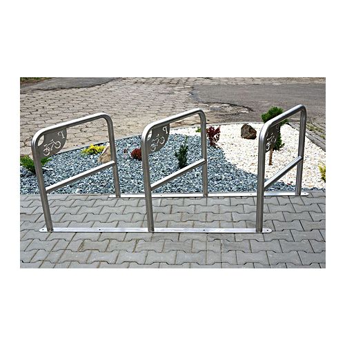 Velosipēdu statīvs 3 velosipēdiem (U-veida) ar 2 pamatnes sliedēm. Izgatavots no nerūsējošā tērauda. Izmēri: garums: 1750mm, dziļums 800mm, augstums 800mm, attālums starp sliedēm: 800mm, caurules diametrs 48,3mm. Velosipēdu novietošana iespējama no abām velosipēdu statīva pusēm. Iespējams regulēt leņķi. Montāžas skrūves iekļautas cenā! Augsta izturība pret ārējiem apstākļiem.