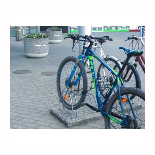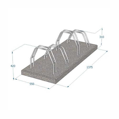 Velosipēdu statīvs 4 velosipēdiem ar betona pamatni. Izgatavots no betona pamatnes ar metāla turētājiem. Piemērots 4 velosipēdiem. Velosipēdus iespējams novietot 2 līmeņos. Izmēri: garums 1375mm, platums 550mm, augstums 310mm-420mm. Svars: 140kg. Iespējamie betona toņi: P101, P103, P106.
