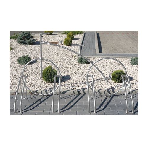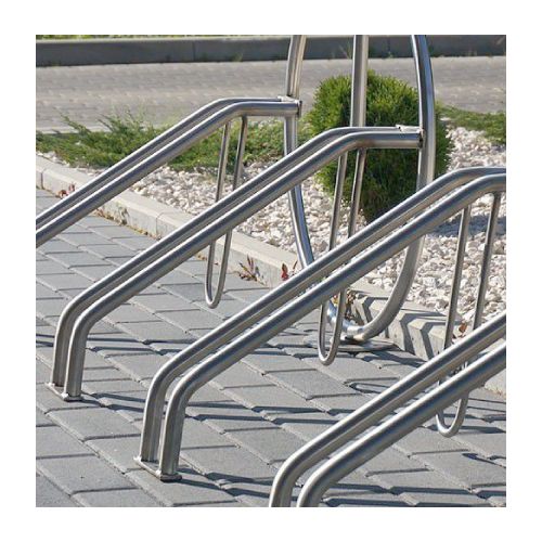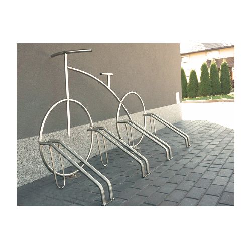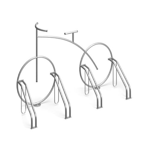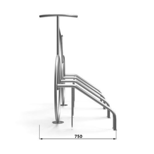 Velosipēdu statīvs ROW. Paredzēts 4 velosipēdu novietošanai. Interesants dizains – imitēta velosipēda konstrukcija. Stiprināms pie pamatnes ar skrūvēm. Materiāls: cinkots tērauds, iespējams krāsot RAL tonī vai izgatavot no nerūsējošā tērauda par papildus samaksu. Izmēri: garums 1800mm, augstums 1100mm, dziļums 750mm, attālums starp riteņiem 560mm, metāla caurules d=25mm. Foto redzams statīvs no nerūsējošā tērauda.