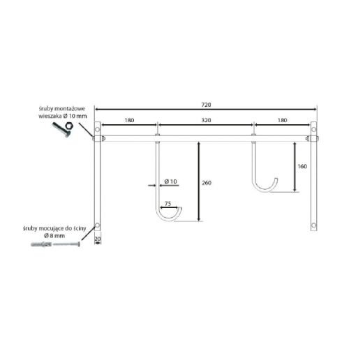 Velosipēdu statīvs LOOP 5. Krāsa: melna vai pelēka (pēc izvēles – norādīt pasūtījuma laikā). Paredzēts piecu velosipēdu novietošanai pie sienas. Maksimālā pieļaujamā slodze: 100kg. Stiprināms ar skrūvēm (komplektā). Iespēja regulēt āķu stāvokli horizontālā plaknē 360 grādu robežās. Divi dažādi āķu garumi ļauj velosipēdus uzstādīt dažādos augstumos, tādējādi novēršot tiešu kontaktu starp tiem. Izmēri: garums 1740mm, augstums 360mm, dziļums 370mm, profils 20x20x1.5mm, attālums starp velo pakaramajiem 320mm, atstatums starp velo pakaramajiem 75mm, āķa biezums 10mm. Foto ilustratīvs – neatbilst reālajam velosipēdu novietošaans skaitam!