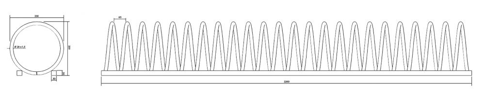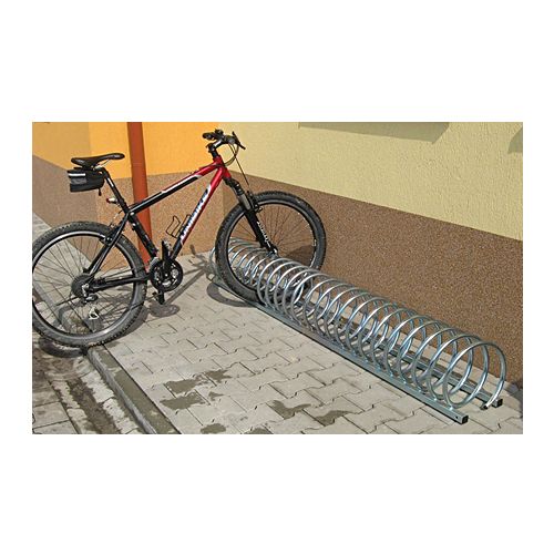 Spirālveida velosipēdu statīvs. Paredzēts 8 velosipēdu novietošanai. Cinkots, iespējams krāsot par papildu samaksu. Izmēri: garums 220cm, dziļums 33cm, augstums 33cm, attālums starp mietturiem 6,5cm. Svars: 21,2kg.