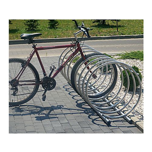 Spirālveida velosipēdu statīvs vismaz 4 velosipēdu novietošanai. Liela diametra spirāles riņķi (nodrošina lielāku velosipēda stabilitāti un slēdzenes pieslēgšu pie riteņa rāmja). Paredzēts 4 velosipēdu novietošanai. Cinkota tērauda + krāsots kādā no RAL toņiem. Montāža ar skrūvēm (skrūves ietilpst komplektā!). Izmēri: garums 150cm, augstums 60cm, attālums starp pozīcijām 20cm, spirāles caurules diametrs Ø 25mm, pamatnes konstrukcijas Ø 42,4mm. Iespējams šo velosipēdu statīvu iegādāties vienkārši cinkota tērauda vai no nerūsējošā tērauda.