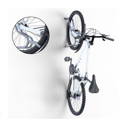 Velosipēdu statīvs WALL 5 riepas platumam līdz 55mm. Paredzēts piecu velosipēdu novietošanai pie sienas. Maksimālā pieļaujamā slodze vienam velosipēdam: 30kg. Stiprināms ar skrūvēm (komplektā). Komplektā arī stiprinājums aizmugurējai riepai (novērš sienu nosmērēšanos un stabilizē velosipēdu). Materiāls: cinkots tērauds. Savietojams ar velosipēdiem, kam ir dubļusargi, disku bremzes, kā arī elektriskajiem velosipēdiem. Izmēri: statīva platums 140mm, statīva garums 500mm, caurules šķērsgriezums d=18mm, caurules biezums 2mm. Statīvs paredzēts riepas platumam līdz 29×2.2 collām (5.5cm platums). Pieejams arī variants līdz 29×3.15 collām (8cm platums), saderība ar bremžu diskiem līdz d=203mm. Svars: 12.5kg.