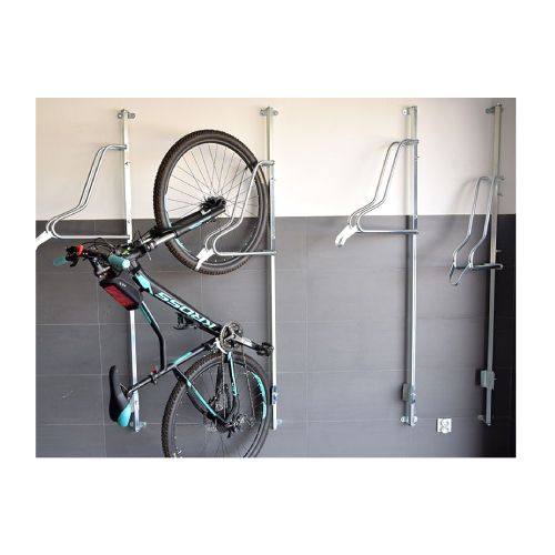 Velosipēdu statīvs WALL PREM 4 riepas platumam līdz 80mm. Paredzēts četru velosipēdu novietošanai pie sienas. Pilnībā regulējams (uz augšu-leju/ pa kreisi-pa labi) – ļauj pielāgot pozīciju. Statīvu var pārvietot horizontāli, atvieglojot velosipēda noņemšanu un noevietošanu, ja attālumi starp velosipēdiem ir mazi. Maksimālā pieļaujamā slodze: 30kg. Stiprināms ar skrūvēm (komplektā). Komplektā arī stiprinājums aizmugurējai riepai (novērš sienu nosmērēšanos un stabilizē velosipēdu). Materiāls: cinkots tērauds. Savietojams ar velosipēdiem, kam ir dubļusargi, disku bremzes, kā arī elektriskajiem velosipēdiem. Izmēri: statīva dziļums 500mm, statīva vadotnes garums 1800mm (profils 25x25x1.5mm), caurules šķērsgriezums d=18mm, caurules biezums 2mm. Statīvs paredzēts riepas platumam līdz 29×3.15 collām (8cm platums), saderība ar bremžu diskiem līdz d=203mm. Pieejams arī variants līdz 29×2.2 collām (5.5cm platums). Konkrētais modelis bez speciāla roktura (par papildus samaksu pieejams ar speciālo rokturi, kas paredzēts velosipēda pieslēgšanai pie rāmja). Par papildus samaksu iespējams arī nerūsējošā tērauda variants. Svars: 20kg.