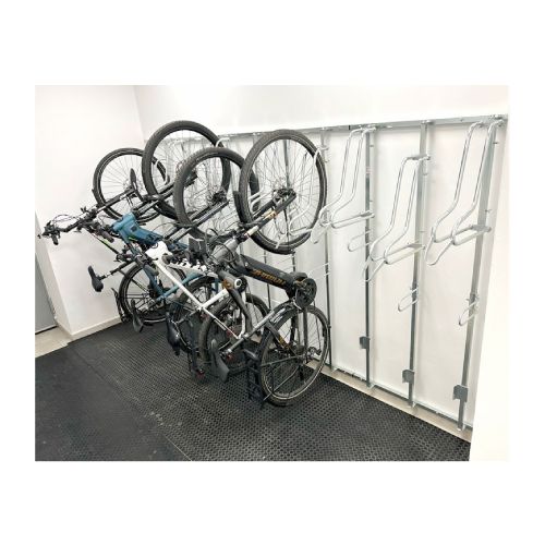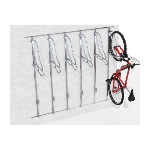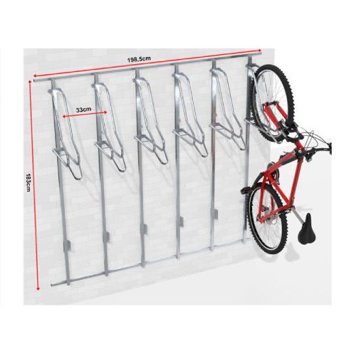 Velosipēdu statīvs WALL PREM 6 ar atbalsta profiliem riepas platumam līdz 80mm. Paredzēts sešu velosipēdu novietošanai pie sienas. Regulējams gan vertikāli, gan horizontāli – tas ļauj pielāgot statīvus izvietot atbilstoši savām vēlmēm. Kopēja atbalsta konstrukcija, kas atvieglo montāžu pie sienas. Maksimālā pieļaujamā slodze: 30kg. Stiprināms ar skrūvēm (komplektā). Komplektā arī stiprinājums aizmugurējai riepai (novērš sienu nosmērēšanos un stabilizē velosipēdu). Materiāls: cinkots tērauds. Izmēri: statīva dziļums 500mm, platums 1985mm (montāžas profils 25x25x1.5mm), statīva vadotnes garums 1800mm (profils 25x25x1.5mm), caurules šķērsgriezums d=18mm, caurules biezums 2mm, attālums starp velosipēdiem 330mm. Statīvs paredzēts riepas platumam līdz 29×3.15 collām (8cm platums), saderība ar bremžu diskiem līdz d=203mm; pieejams arī variants līdz 29×2.2 collām (5.5cm platums). Konkrētais modelis bez speciāla roktura (par papildus samaksu pieejams ar speciālo rokturi, kas paredzēts velosipēda pieslēgšanai pie rāmja). Par papildus samaksu iespējams arī nerūsējošā tērauda variants. Svars: 30kg.