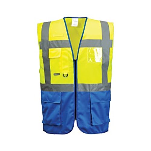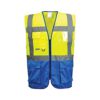 Veste ar praktiskām kabatām un kabatu ID kartei. Krāsu kombinācija: dzeltena ar koši zilu apakšu. Rāvējslēdzēja aizdare. Materiāls: 100% poliesters 125g/m2. Izmēri: XS līdz 5XL.