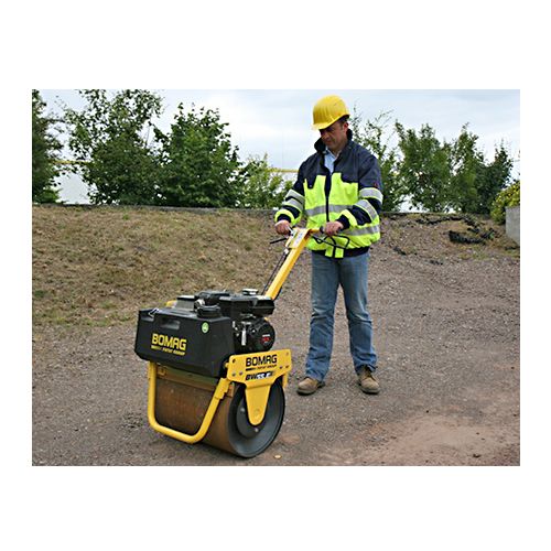 Vibrorullis BOMAG BW 55. Viens valcis. Ar ūdens izsmidzināšanas sistēmu. Darba virsmas platums 560mm. Trieciens 10kN. Jauda 2,2kW. Svars: 161kg.