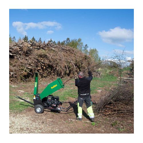 Zaru šķeldotājs – smalcinātājs zariem un kokiem līdz d=85mm. Smalcina koksnes atgriezumus, zarus, ko var izmantot kā kurināmo materiālu, segšanas materiālu dārzos, celiņu ierīkošanai, kompostam u.c. Darbināms ar 4-taktu benzīna dzinēju (15ZS). Aprīkots ar avārijas apturēšanu. 2 ķīļsiksnas, 2 griešanas naži un 1 pretnazis. Dakšu turētājs ērtai transportēšanai. Padevees piltuves izmērs 470x330mm. Padeves veltnis ir jaudīgs, darbojas ātri. Veltnim ir 2 stabili rotējoši naži ar platumu 300mm, kā arī pretnazis, kuru darbina benzīna dzinējs. Asmeņu leņķis un novietojums nodrošina to, ka zari tiek automātiski ievilkti padeves veltnī, ļaujot zarus atbrīvot, tiklīdz asmeņi tos satver. Padeves piltuves atvere aprīkota ar plastmasas sloksnēm, kas aizsargā pret mizu vai šķeldas gabaliņu izmešanas. Izmantojot rotora radīto centrbēdzes spēku, sasmalcinātā koksne vai skaidas tiek izvadītas caur izmešanas cauruli. Piedziņas vārpsta iet cauri divām paralēlām piedziņas siksnām. Augstums no grīdas līdz padeves tvertnei ir 110 cm, labākais darba augstums no ergonomiskā viedokļa. Smalcinātāju var viegli pārvietot stumjot vai ar dārza traktoru, zāles pļāvēju, izmantojot dakšas stiprinājumu. Aprīkots ar 2 riepām 15 collu (ar gaisu pildītas). Izmēri: garums 2310mm, platums 800mm, augstums 1500mm.