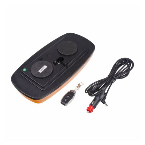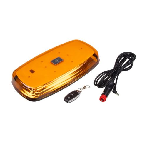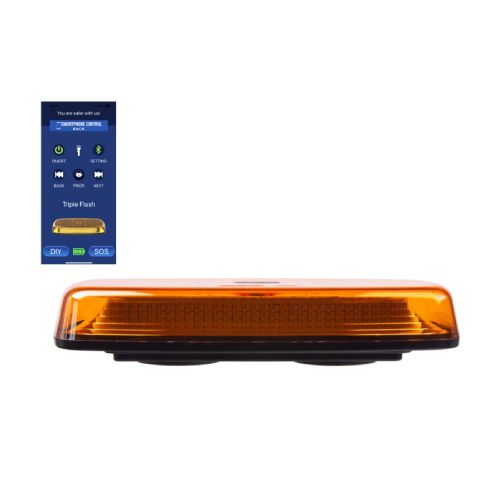Zemprofila bākuguns uz magnēta ar pulti vai Bluetooth APP (iPhone/Android). Lādējama. Izmēri: garums 304mm, platums 157mm, h=44mm. 84 LED diodes. Jauda: 38W. R65 spožuma klase. IP67 mitruma aizsardzības klase. Barošanas spriegums: 12-24V (lādētājs). Ar pilnu 4.5h uzlādi bākuguns darbojas aptuveni 6.5h. Maksimālais attālums, lai pults darbotos – r=30m. Komplektā arī auto lādētājs. 7 mirgošanas režīmi. Darba temperatūra: -40 līdz +60 grādi pēc Celsija.