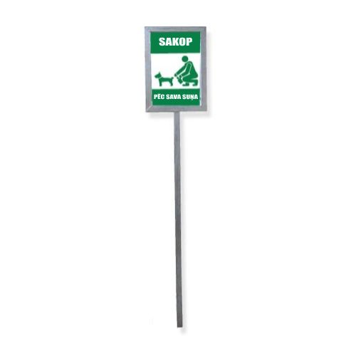 Zīme ar atbalsta konstrukciju “Sakop pēc sava suņa”. Izmēri: plāksnes izmērs 200x300mm (cits dizains pēc pieprasījuma), atbalsta konstrukcijas augstums 1360mm.